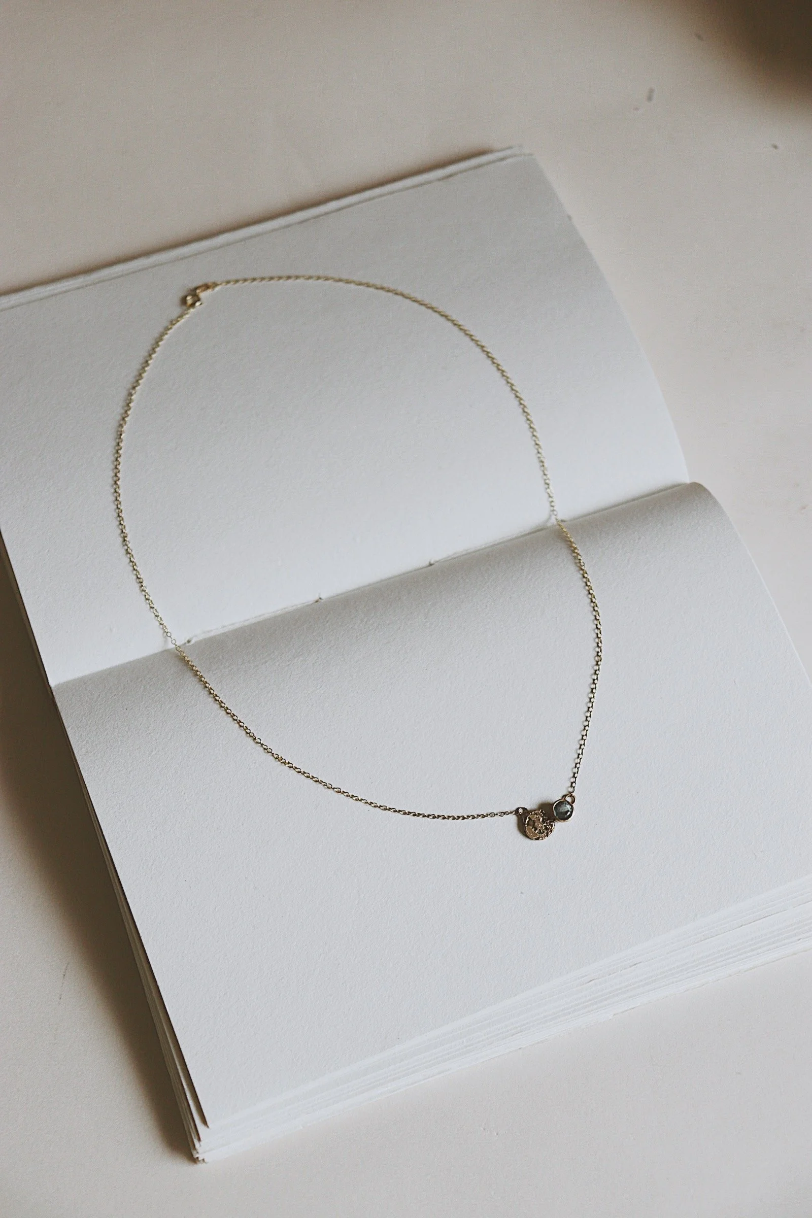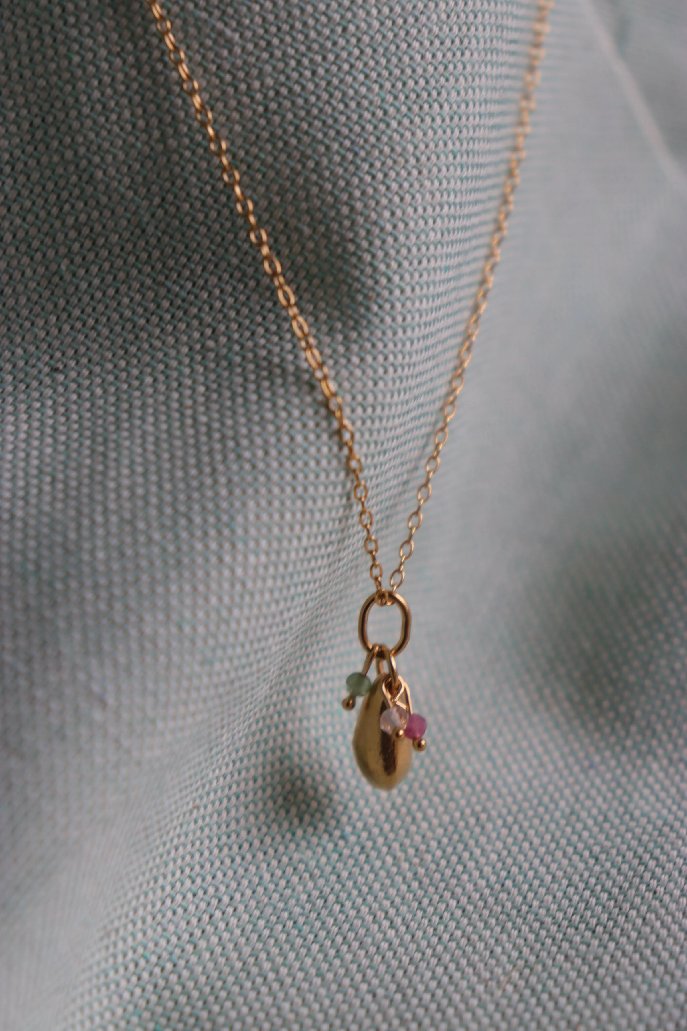 Available in sterling silver or gold plated silver, each pendant cradles a single stone — a flicker of light within its weathered surface. Choose from, sapphire, pink tourmaline, green tourmaline or cubic zirconia — each stone offering its own energy, a personal ember to carry close.