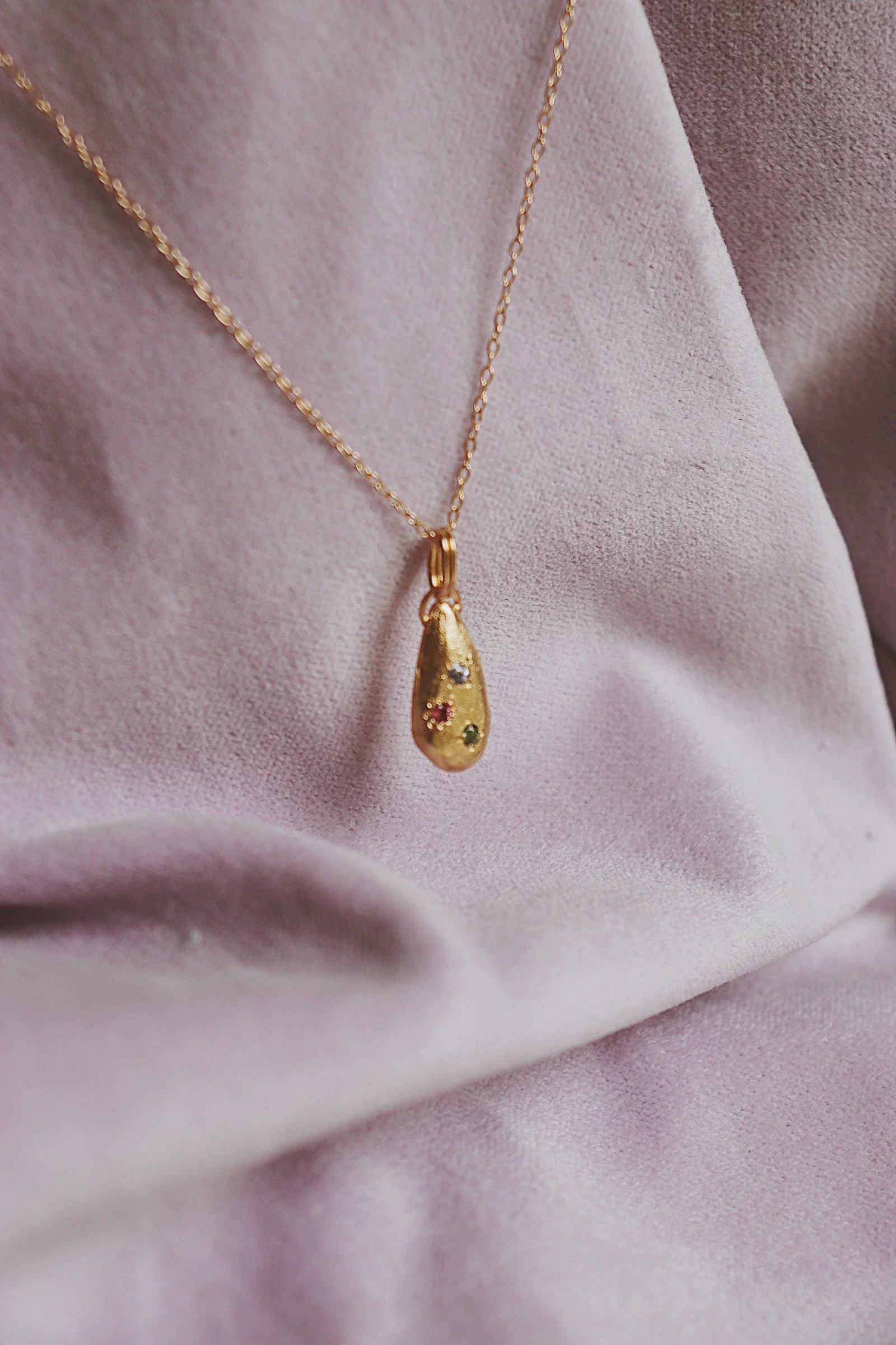 Each gemstone is hand-selected for its subtle hue and individuality, creating a gentle rhythm of colour that shifts as you move.